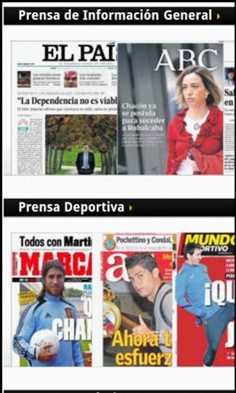 Podrás leer, entre muchos otros: El país, La Vanguardia, La Razón, El Mundo, El Periódico, ABC , Marca, Mundo deportivo, Sport, 20 minutos, Qué!, ADN , El Correo, La Voz de Galicia, Público, El Diario Vasco,La Nueva España, Diario de Navarra, Heraldo de Aragón, La Gaceta, Faro de Vigo, Levante, El Norte de Castilla; toda la prensa regional de España a diario y revistas como Hola, Diez Minutos, MAN, GQ, FHM, Elle, Cosmopolitan, Muy Interesante, QUO, Emprendedores, El jueves,Interviú y muchas más!, Sigue la Formula 1, moto GP, tenis, baloncesto, fútbol y todos los deportes.